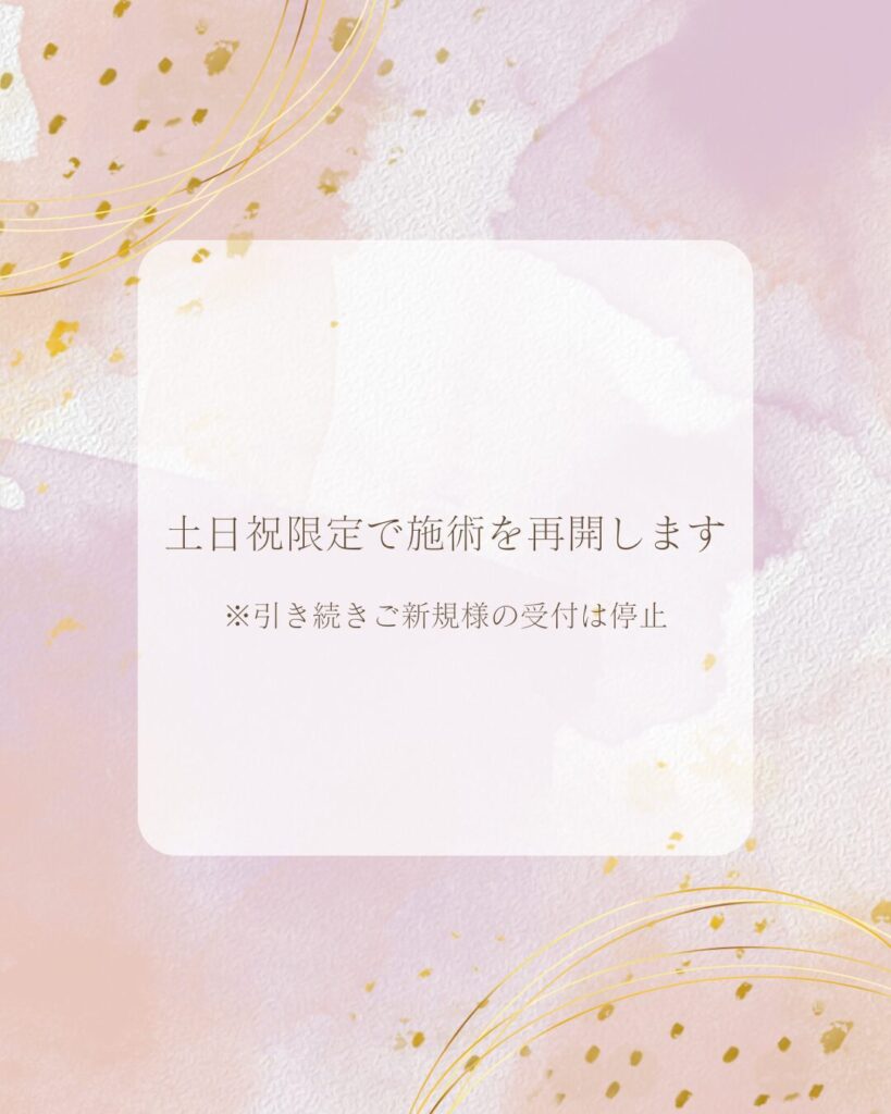 稼働日・稼働時間が少ないため、ご予約が取りづらいかと存じますが、急ぎの施術をご希望の場合はその旨お伝えいただき、可能な限りで施術をさせていただきたいと思っております。